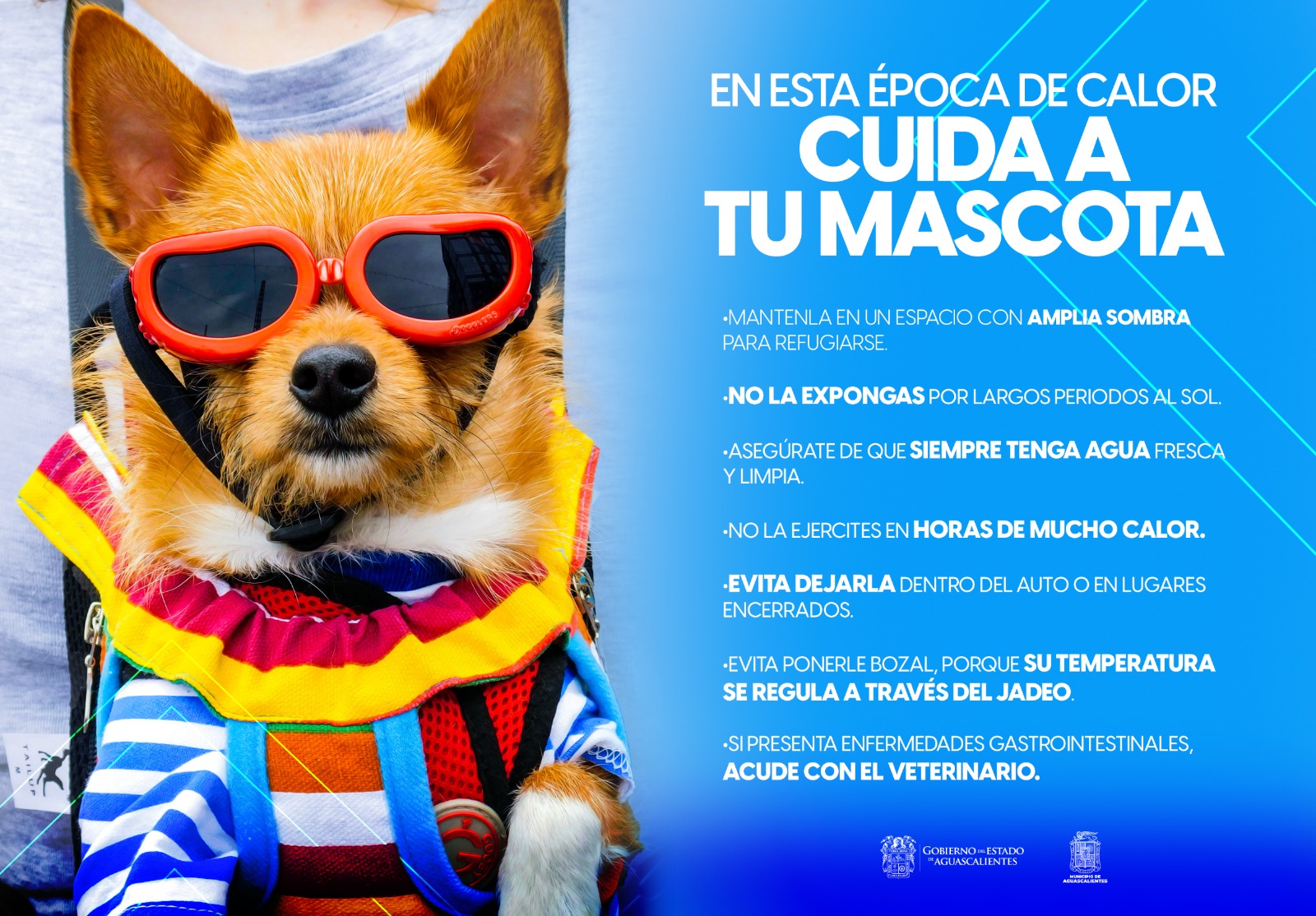 El Gobierno del Estado y el Municipio de Aguascalientes invitan a los propietarios de mascotas a seguir algunas sencillas medidas en esta temporada de calor que pueden significar una diferencia vital para la salud de sus mascotas; esto, ante las elevadas temperaturas que pueden derivar en golpes de calor que pongan en riesgo su vida.