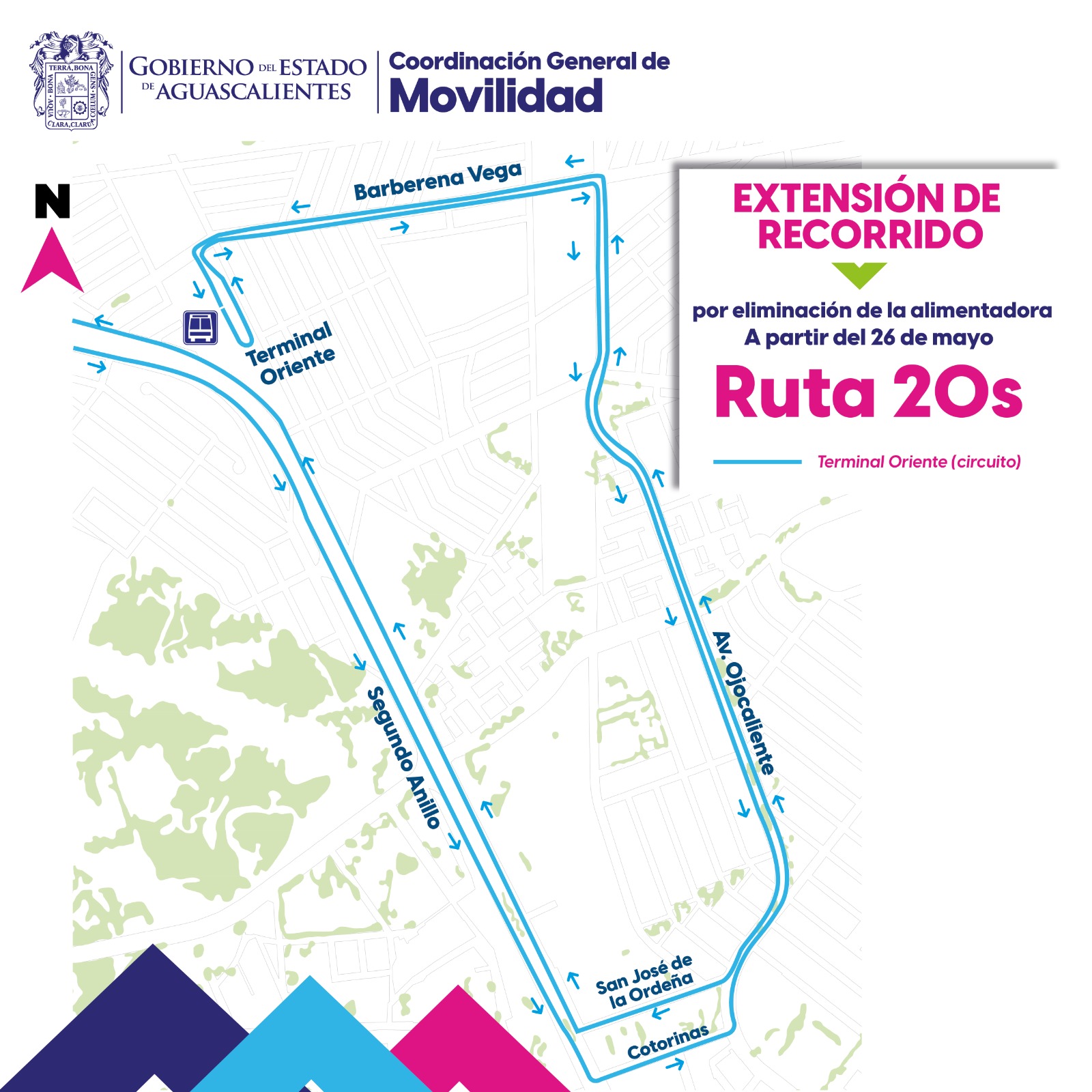 El Gobierno del Estado informa a los usuarios del transporte público que a partir del domingo 26 de mayo, las rutas 20 Norte y 20 Sur tendrán modificaciones en su trayecto; ahora realizarán un recorrido por las avenidas Miguel Ángel Barberena, Ojocaliente y Segundo Anillo.