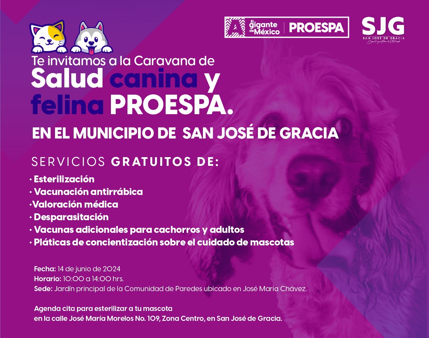 La Procuraduría Estatal de Protección al Ambiente (Proespa) invita a las y los propietarios de mascotas a participar en la Caravana de la Salud Canina y Felina que se llevará a cabo este viernes 14 de junio en la comunidad de Paredes, en el municipio de San José de Gracia.