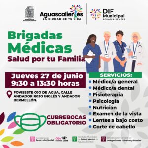 El DIF Municipal de Aguascalientes, invita a la ciudadanía a las Brigadas Médicas “Salud por tu Familia”, que se llevan a cabo en diferentes colonias, fraccionamientos y comunidades.