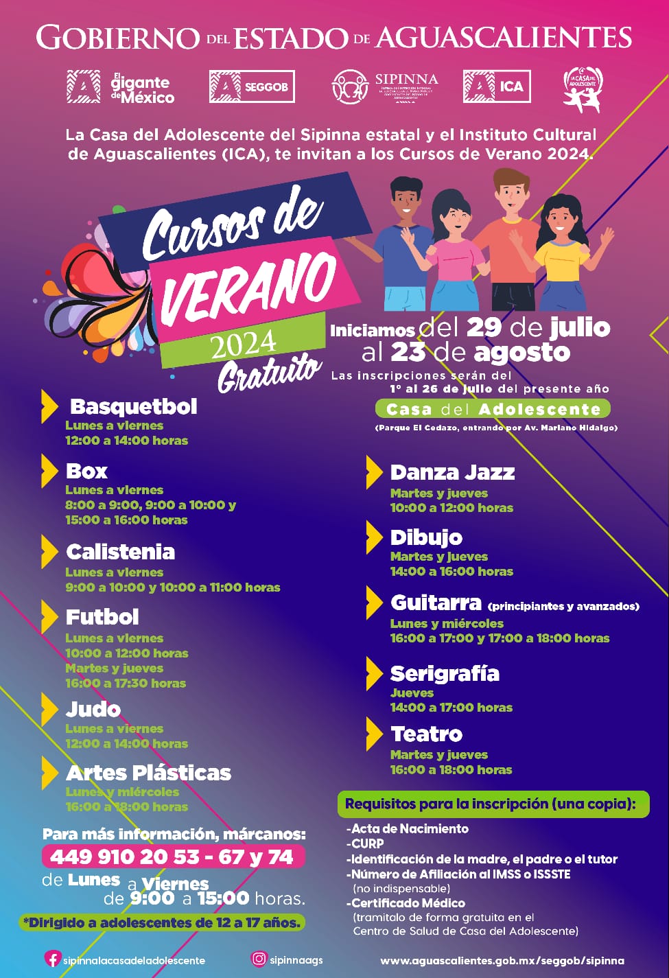 Para más información favor de comunicarse a los teléfonos 449 910 20 53, 449 910 20 67 o 449 910 20 76; en la página web www.aguascalientes.gob/seggob/sipinna, o bien en las redes socialeshttps://www.facebook.com/sipinnalacasadeladolescente yhttps://www.instagram.com/sipinnaags/