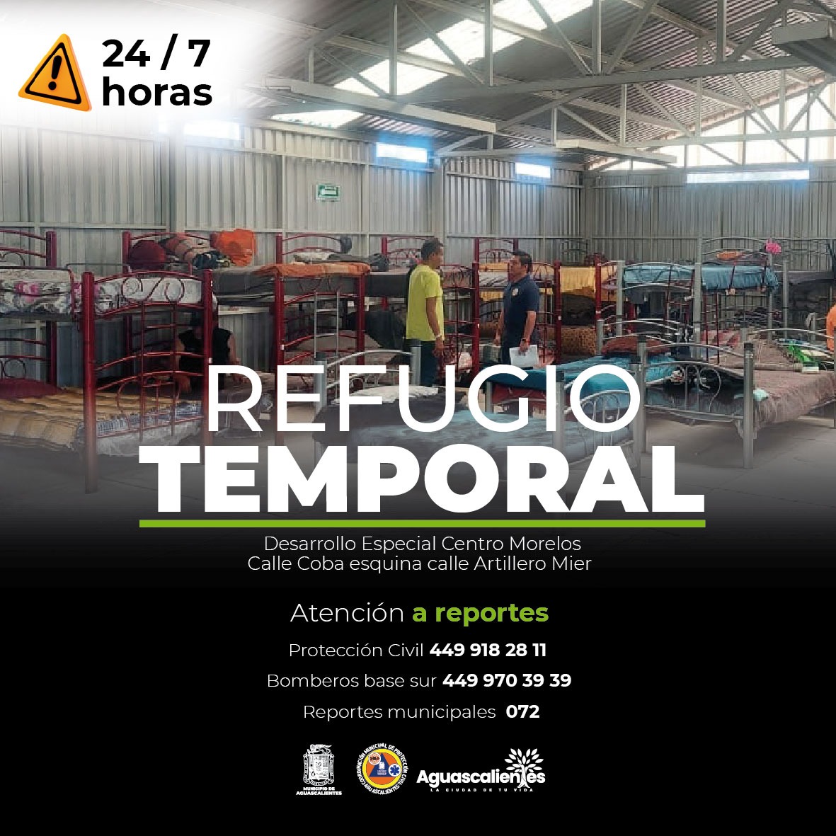 La Coordinación Municipal de Protección Civil informa que mantiene activo el refugio temporal para salvaguardar la integridad de personas en situación de calle, quienes son resguardados y atendidos en las instalaciones ubicadas en calle Coba y Artillero Mier, en el fraccionamiento Morelos.