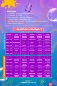 Las actividades están diseñadas para niñas y niños de 5 a 12 años, y comprenden talleres educativos, deportes, artes y mucha diversión; el horario del curso es de las 8:45 de la mañana a las 2:30 de la tarde.