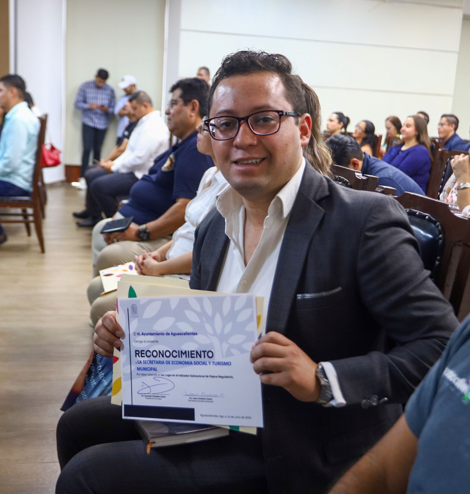 Asimismo, en esta ceremonia efectuada en el Salón de Cabildo, se llevó a cabo la entrega de reconocimientos en Mejora Regulatoria a titulares y enlaces de las diferentes áreas del Municipio de Aguascalientes.