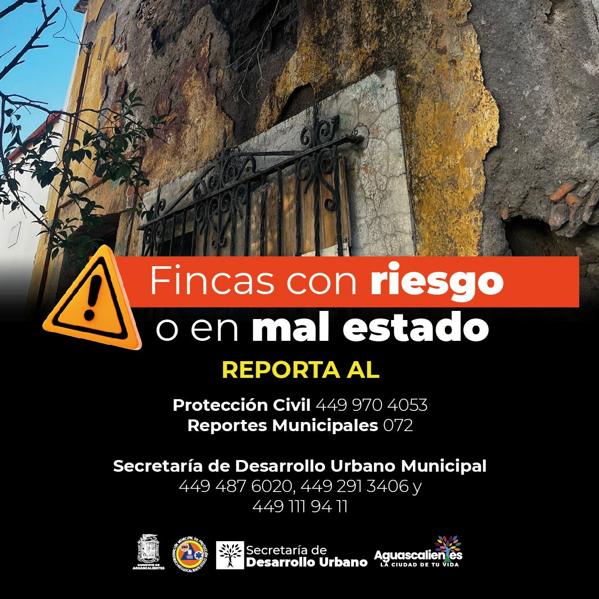 Finalmente, el Municipio de Aguascalientes reitera el llamado a la población a reportar cualquier situación a los números telefónicos  449 970 40 53 de Protección Civil; de Desarrollo Urbano: 449  487 60 20, 449 291 34 06, 449 111 94 11 y la línea de atención ciudadana 072.