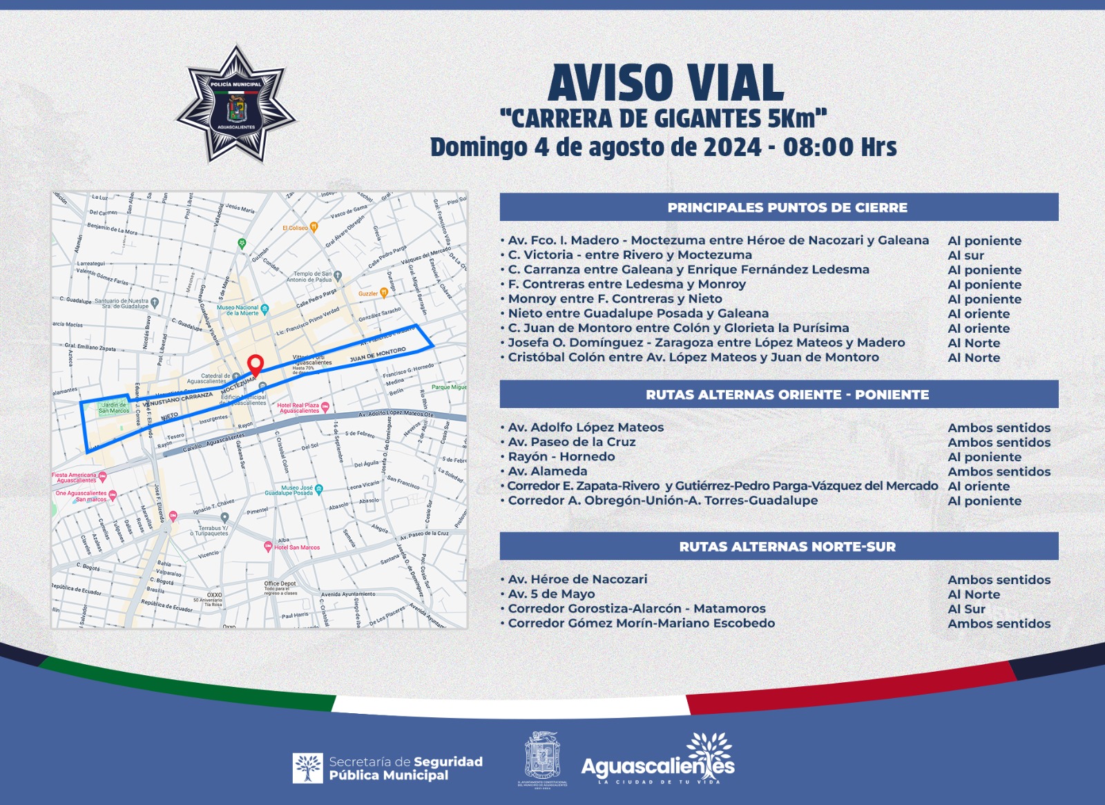 La Policía Vial de Aguascalientes de la Secretaría de Seguridad Pública Municipal de Aguascalientes (SSPM), tiene listo el operativo para la «Carrera de Gigantes 5KM», que se llevará a cabo el próximo domingo 4 de agosto en punto de las 08:00 horas.