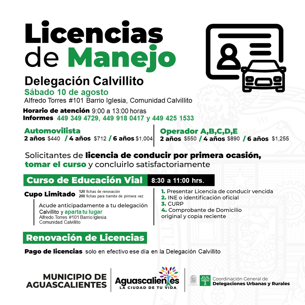 La Coordinación General de Delegaciones Urbanas y Rurales hace una atenta invitación a la ciudadanía que desea renovar su licencia de manejo a acudir este próximo sábado 10 de agosto a la Delegación Calvillito a fin de poder realizar este trámite.