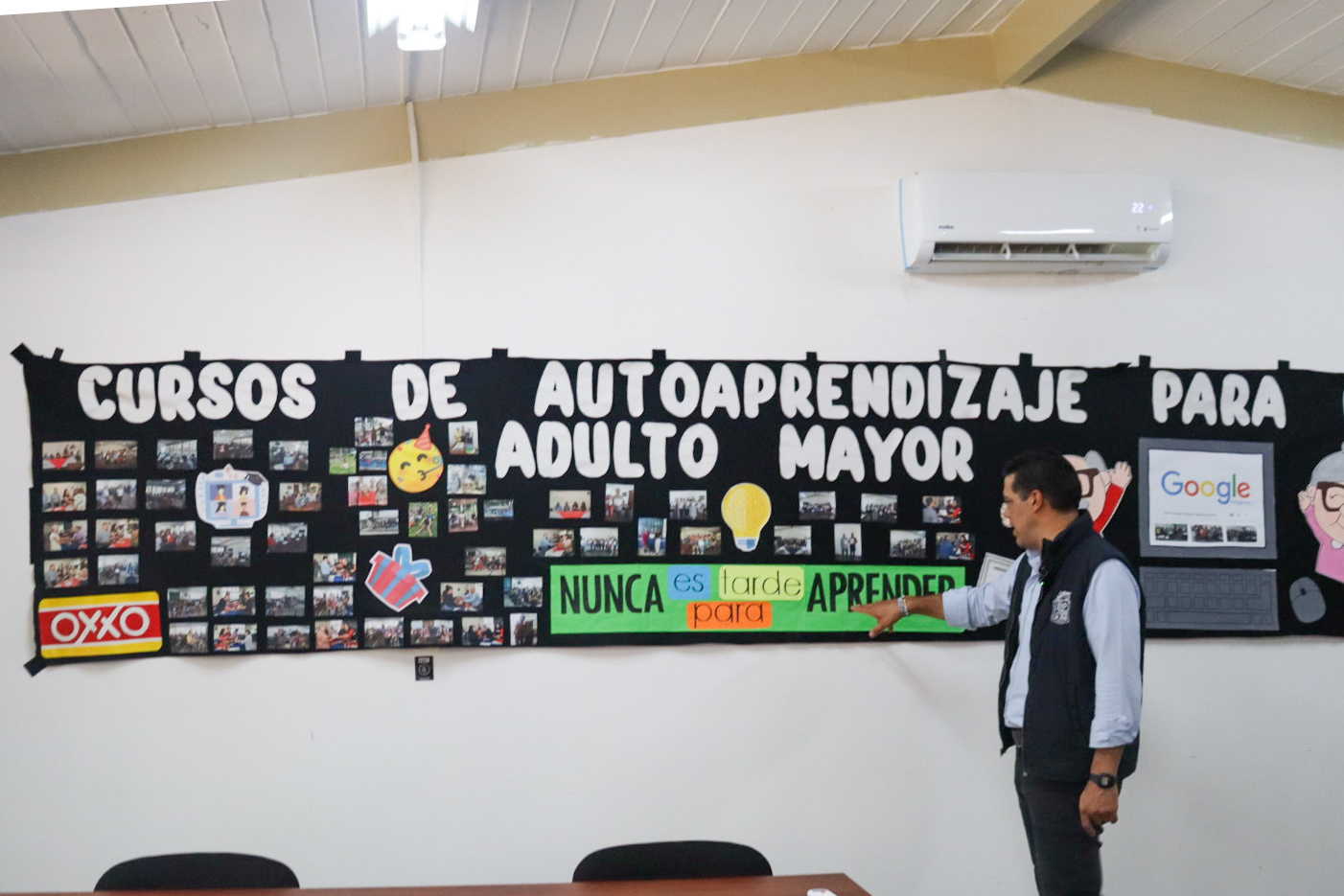 Posteriormente, se trasladó al Centro de Atención Integral para el Adulto Mayor “Prof. Enrique Olivares Santana”, en el que se imparten actividades como Tai Chi, coro, guitarra, tejido, tanatología, computación, manejo de celular y redes sociales, entre otras actividades.