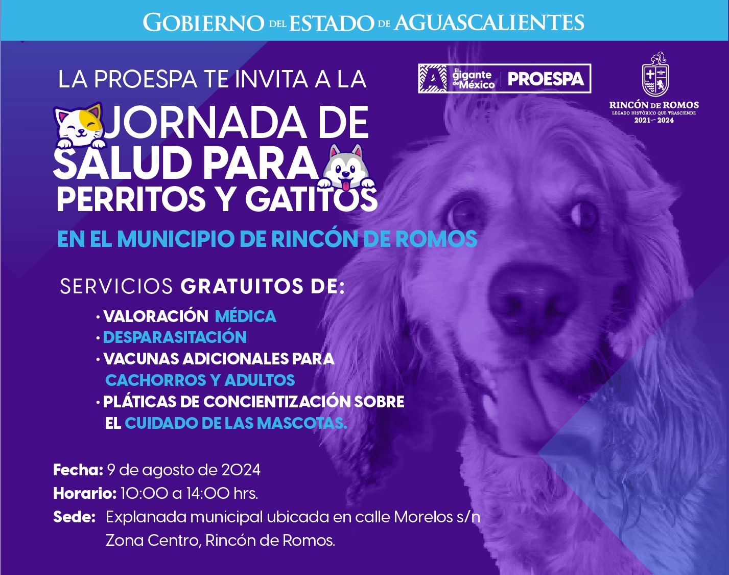 El Gobierno del Estado, a través de la Procuraduría Estatal de Protección al Ambiente (Proespa), invita a las y los propietarios de mascotas de compañía a participar en la Jornada de Salud para Perritos y Gatitos que se llevará a cabo este viernes 9 de agosto en el municipio de Rincón de Romos.