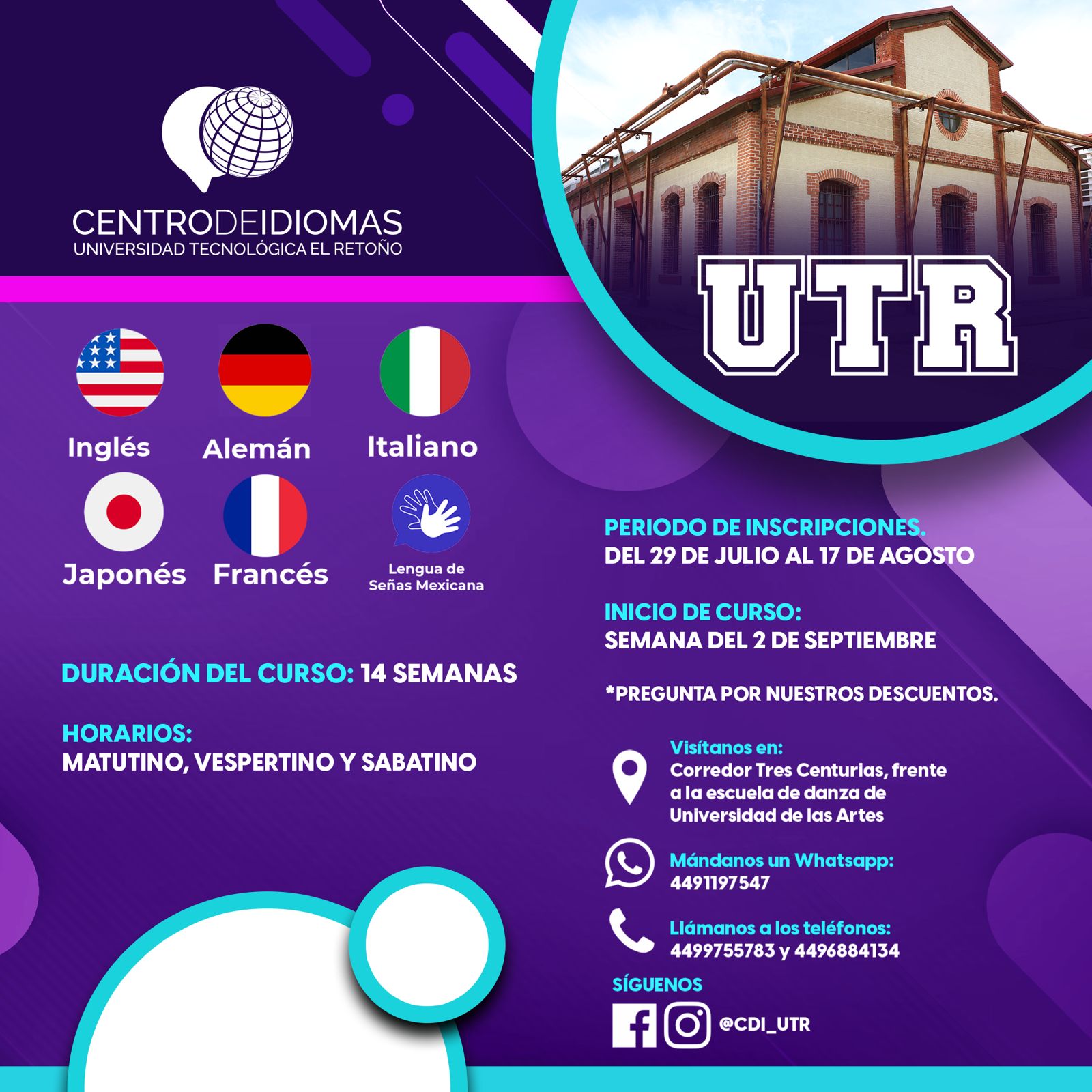 El Gobierno del Estado invita a participar en los cursos de inglés, francés, alemán, italiano, japonés, así como de lengua de señas que imparte la Universidad Tecnológica El Retoño (UTR); el periodo de inscripciones ya está abierto y concluye el 17 de agosto.
