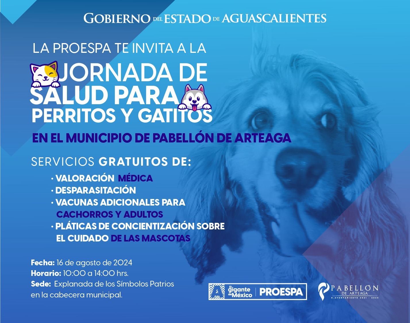 El Gobierno del Estado, a través de la Procuraduría Estatal de Protección al Ambiente (Proespa), invita a las y los propietarios de mascotas a participar en la Jornada de Salud para perritos y gatitos que se llevará a cabo en el municipio de Pabellón de Arteaga este viernes 16 de agosto.