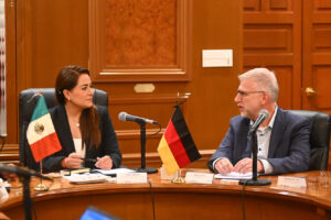 La gobernadora de Aguascalientes, Tere Jiménez, sostuvo una reunión de trabajo con altos directivos de la empresa Mercedes Benz U....