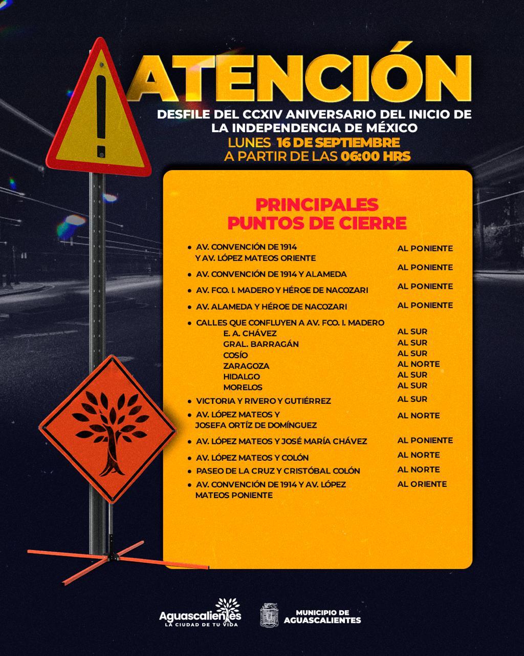 La Secretaría de Seguridad Pública Municipal, a través de la Policía Vial anunció el cierre de diversas calles en el centro de la ciudad este lunes 16 de septiembre por el Desfile Cívico-Militar con motivo del Aniversario CCXIV del Inicio de la Independencia de México.