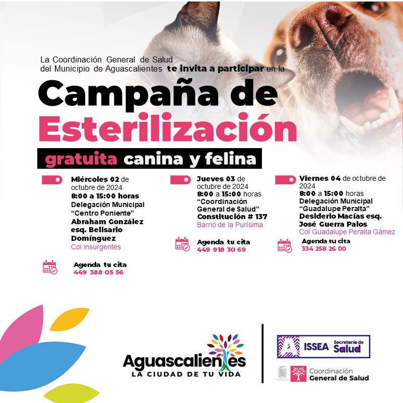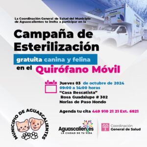 El Municipio de Aguascalientes a través de la Coordinación General de Salud informa que se efectuarán nuevas jornadas de esterilización gratuita canina y felina.