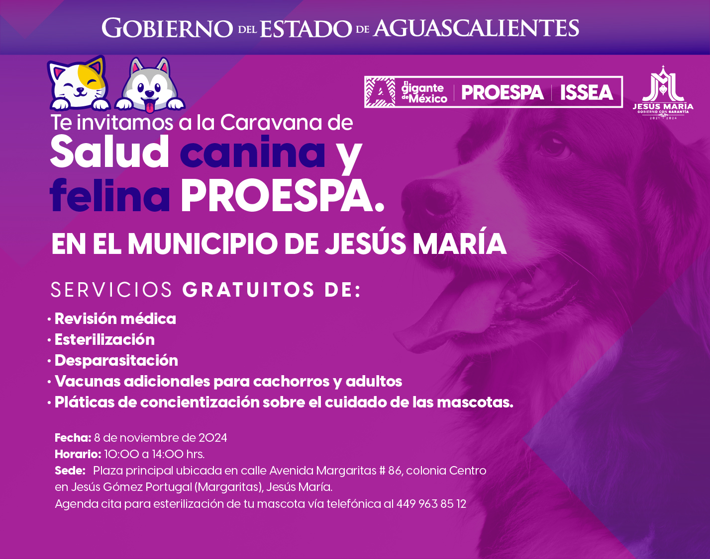 El Gobierno del Estado de Aguascalientes invita a las y los propietarios de mascotas a que asistan este viernes 8 de noviembre a la Caravana de la Salud Canina y Felina que se llevará a cabo en la comunidad Jesús Gómez Portugal (Margaritas), en el municipio de Jesús María.