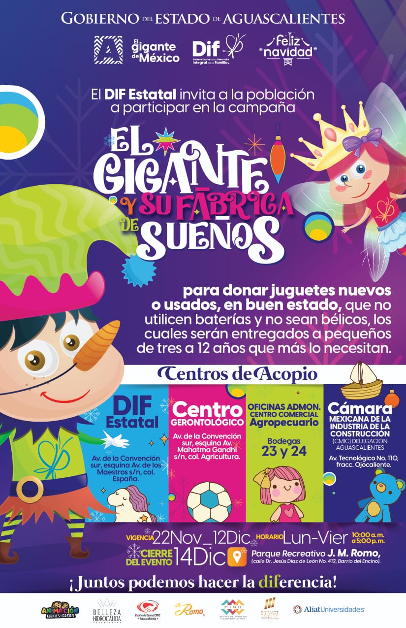 Con el propósito de llevar un momento de alegría en esta Navidad a pequeños de la Casa Hogar DIF y a los que viven en las comunidades y municipios más necesitados de Aguascalientes, la presidenta del Sistema DIF Estatal, Aurora Jiménez Esquivel, invitó a la sociedad a sumarse a la campaña “El Gigante y su Fábrica de Sueños” con la donación de juguetes.