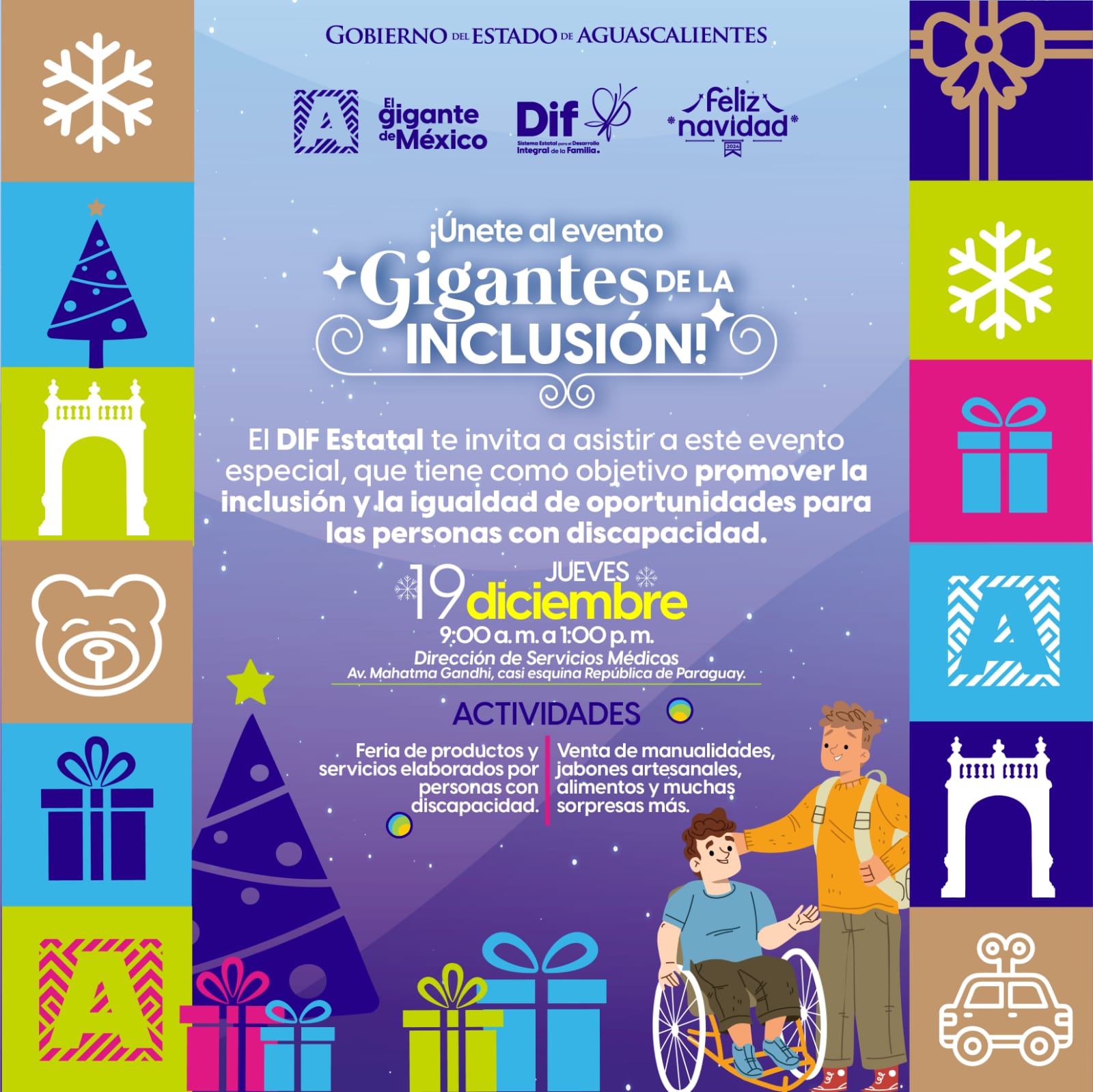El Sistema DIF Estatal invita a la población a asistir este jueves 19 de noviembre al evento “Gigantes de la Inclusión”, en el que personas con discapacidad ofrecerán una gran variedad de productos, como manualidades, jabones artesanales, alimentos, entre otros.