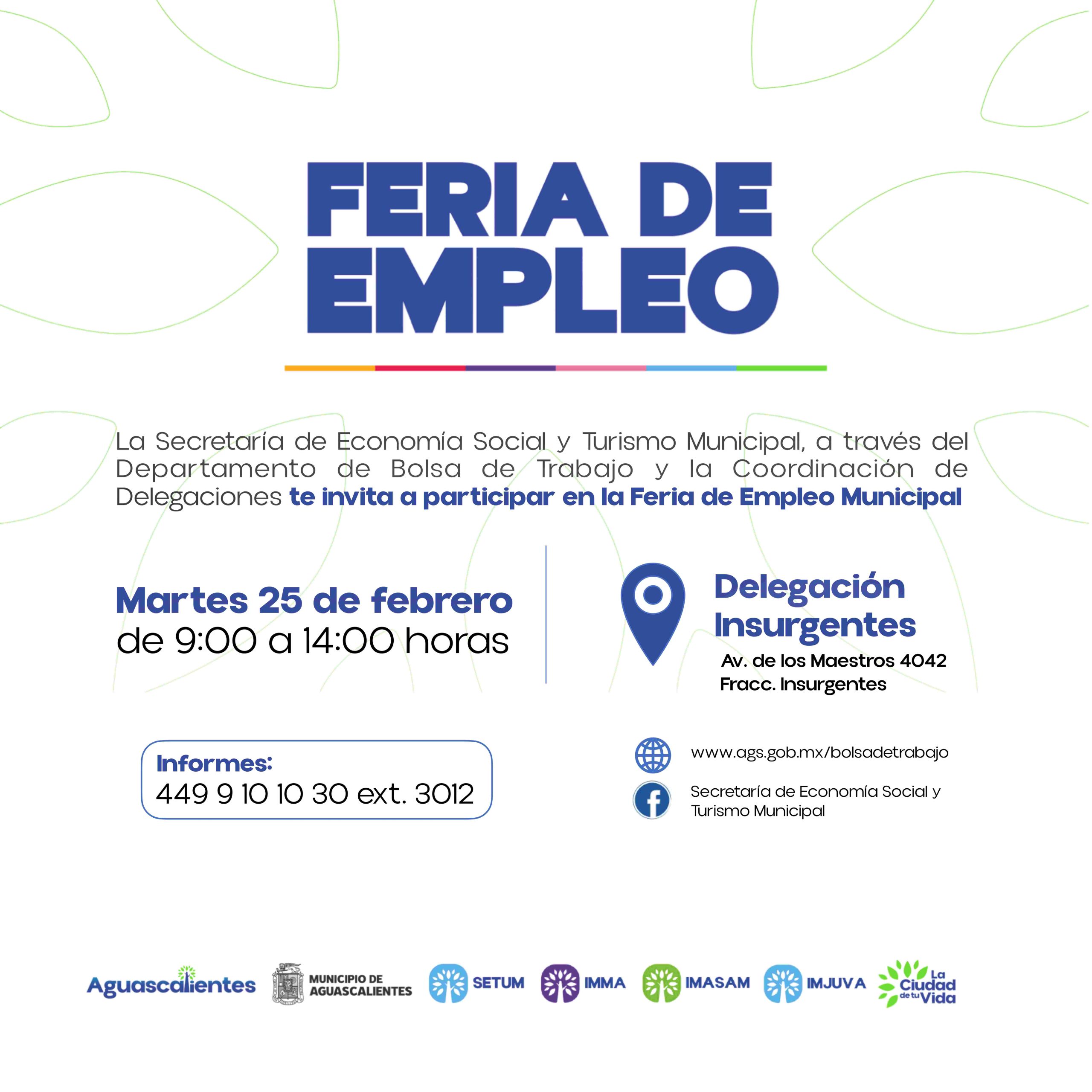 Con el objetivo de seguir fomentando el empleo y fortalecer la economía de las familias, el Municipio de Aguascalientes, a través de la Secretaría de Economía Social y Turismo Municipal (Setum), invita a la ciudadanía a participar en la próxima Feria de Empleo que se llevará a cabo el martes 25 de febrero en la Delegación Insurgentes, ubicada en Av. de los Maestros 4042, Fracc. Insurgentes, de 9:00 a 14:00 horas.