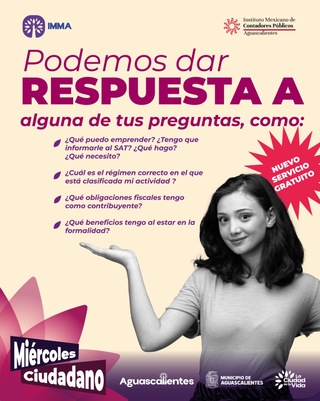 El Instituto Municipal de la Mujer de Aguascalientes (IMMA) en colaboración con el Colegio de Contadores Públicos de Aguascalientes A.C., brinda asesoría contable y económica gratuita en los Miércoles Ciudadanos.
