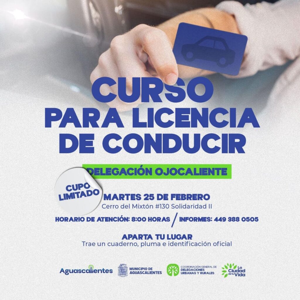 El Municipio de Aguascalientes invita a la ciudadanía que desee tramitar su licencia de manejo por primera vez a tomar el curso de educación vial que se impartirá gratuitamente en la Delegación Ojocaliente el próximo martes 25 de febrero.