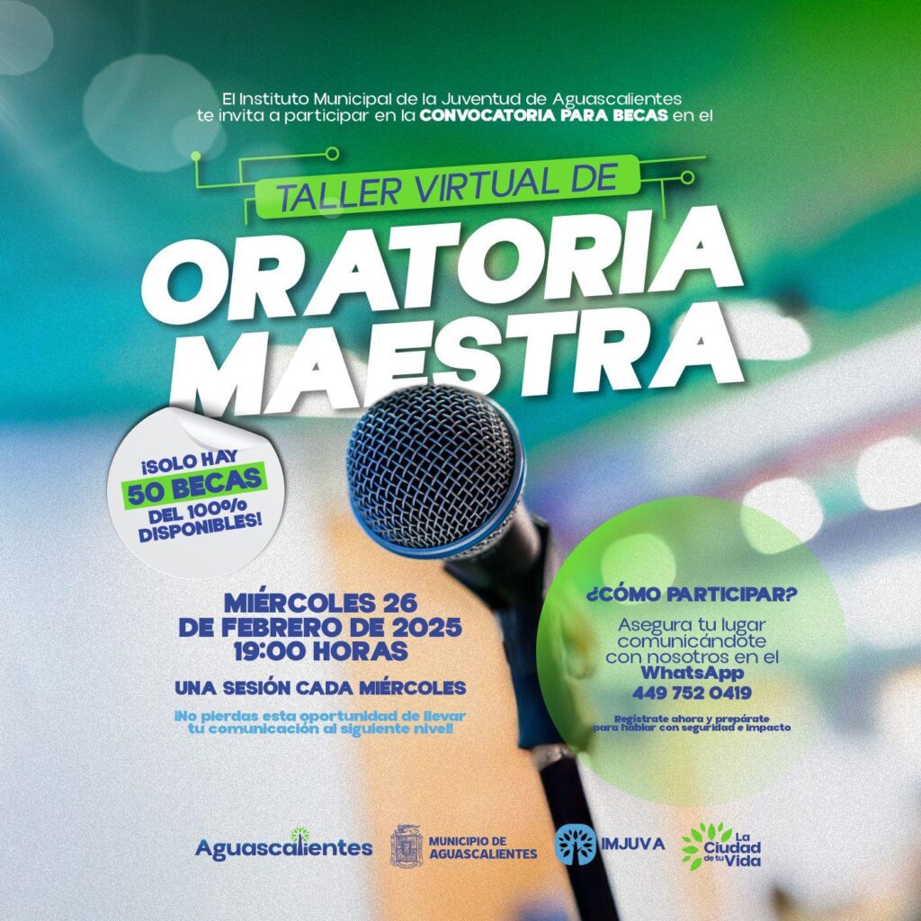 El Instituto Municipal de la Juventud de Aguascalientes (Imjuva) invita a la ciudadanía a ser parte del Taller Virtual de Oratoria Maestra, una excelente oportunidad para aquellos interesados en perfeccionar sus habilidades de comunicación y expresión, como líderes, conferencistas o quienes deseen reforzar su seguridad e impacto al hablar en público.