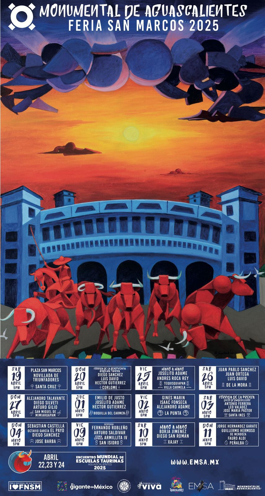 Rafael Sánchez de Icaza, autor de la obra que ilustra el cartel de toros de la FNSM 2025, dijo sentirse muy orgulloso por haber realizado la pintura que viste estos festejos y destacó que plasmó los atardeceres de Aguascalientes, la Plaza de Toros Monumental y un encierro de seis toros, además de que festeja 50 años de pintor en el 50 aniversario de la Plaza de Toros Monumental.