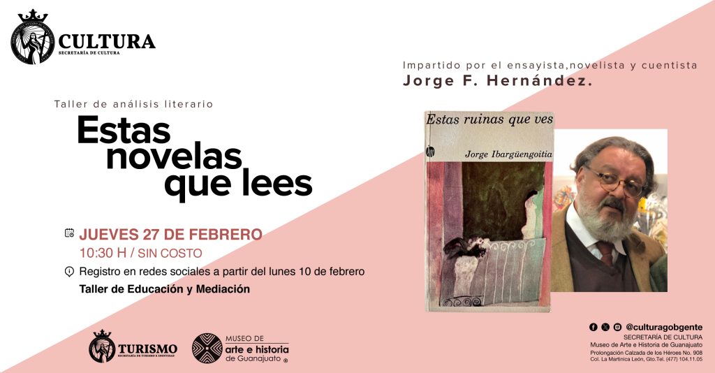 . El Museo de Arte e Historia de Guanajuato abre sus puertas a la literatura con el taller de análisis literario “Estas novelas que lees”, impartido por el reconocido ensayista, novelista y cuentista Jorge F. Hernández . La actividad se llevará a cabo el jueves 27 de febrero de 2025 a las 10:30 horas, en un formato híbrido que permitirá la participación tanto presencial como virtual.