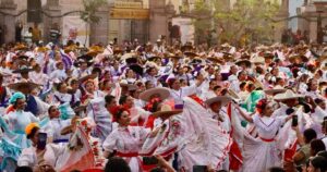 Más de mil 700 bailarines de Aguascalientes, Jalisco, Oaxaca, Chihuahua, Zacatecas y Nuevo León ejecutaron la coreografía Pelea de Gallos Monumental en Plaza de la Patria para rendir homenaje a la disciplina artística de la danza.