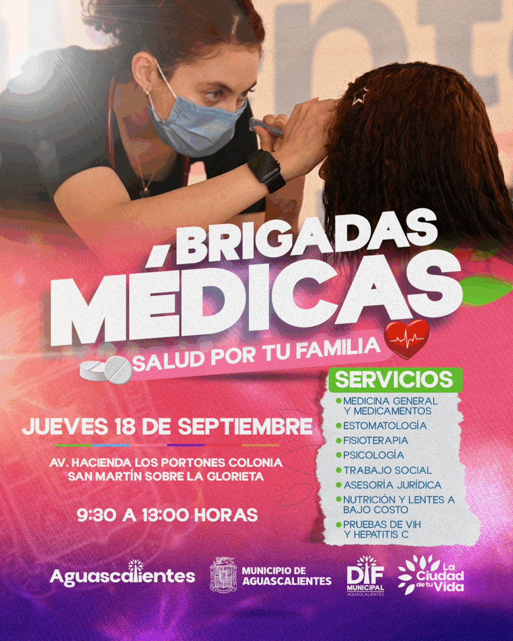 El DIF Municipal de Aguascalientes invita a la población a la brigada médica que se llevará a cabo el próximo 18 de septiembre en la glorieta de la Av. Hacienda Los Portones, en la Colonia San Martín, en un horario de 9:30 a 13:00 horas.