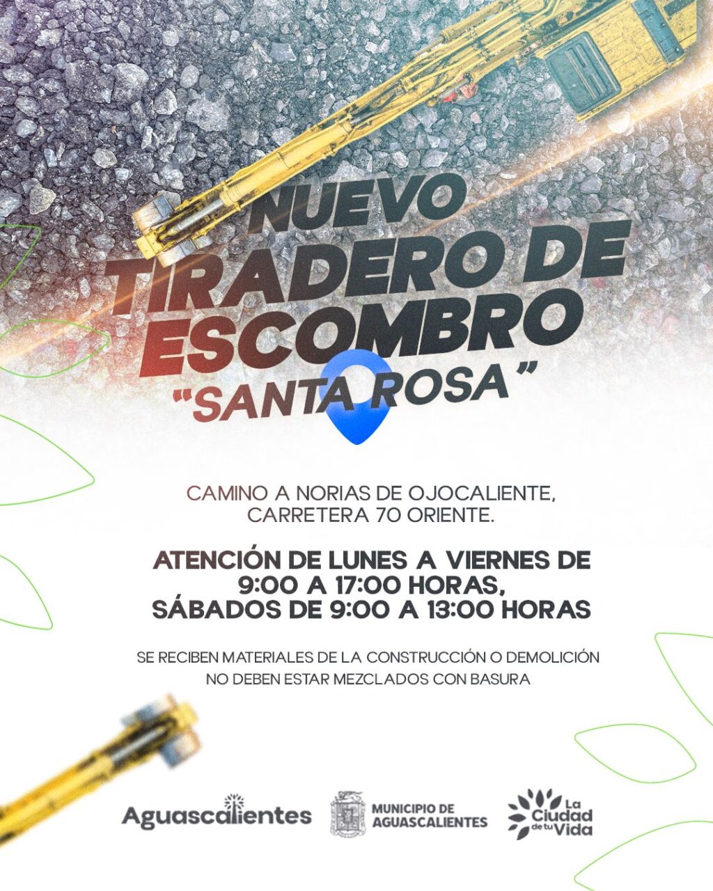 El Municipio de Aguascalientes, a través de la Secretaría de Obras Públicas Municipales (SOPMA), habilitó el nuevo tiradero de escombro “Santa Rosa”, que será el único lugar autorizado para la disposición de este tipo de residuos en Aguascalientes.