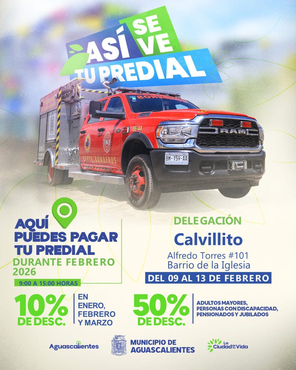 Para evitar traslados, del 9 al 13 de febrero se ofrecerá este servicio  en la Delegación Calvillito,  cuyas oficinas se ubican en calle Alfredo Torres No. 101, Barrio de la Iglesia, donde se atenderá a las y los contribuyentes que deseen regularizar o realizar su pago correspondiente, de 9:00 a 15:00 horas.