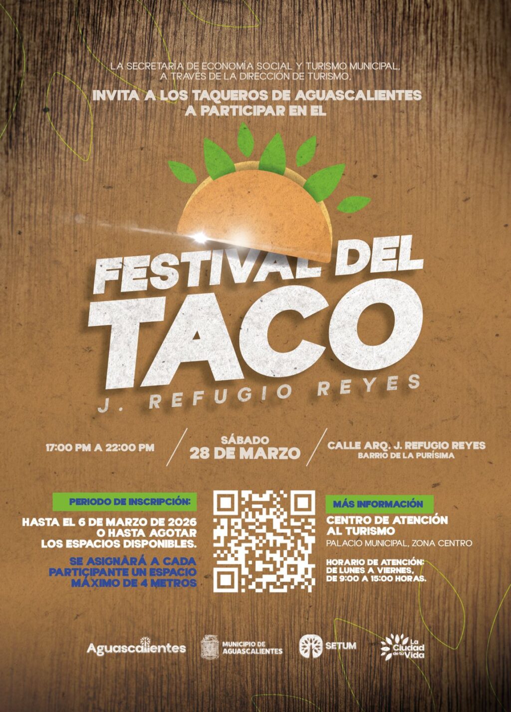 El Municipio de Aguascalientes, a través de la Secretaría de Economía Social y Turismo Municipal (Setum), en el marco del Día Internacional del Taco, invita a las y los taqueros de Aguascalientes a inscribirse y formar parte del Festival del Taco “J. Refugio Reyes”, una celebración que busca reconocer el talento gastronómico local y fortalecer la identidad culinaria de la ciudad.