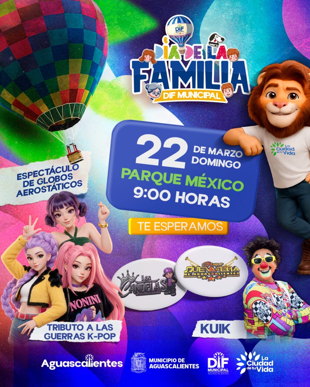 El Municipio de Aguascalientes invita a la ciudadanía a la gran celebración por el Día de la Familia el domingo 22 de marzo en el parque México a partir de las 9:00 horas, con espectáculos artísticos, rifas, inflables gigantes, exhibición de globos aerostáticos, diversión y muchas sorpresas más.